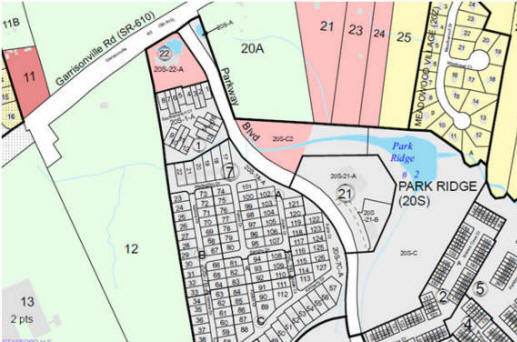 Above, detail of tax map. Source: Stafford County GIS, online Note: The parking in front of the Day Care next door (Tax Map 20S-21-B), fronting on Parkway Blvd. is for the Subject property as well.